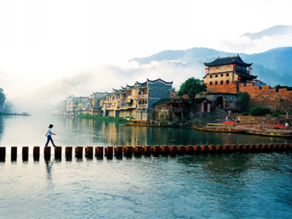 凤凰西南,有一山酷似展翅而飞的凤凰,古城因此而得名。古城位于湖南省湘西自治州西南边,是一个以苗族、土家族为主的少数民族聚集县。风景秀丽、历史悠久、名胜古迹甚多。城内石板小街,古代城楼,明清古院;城外沱江蜿蜒,河水清冽,浆声舟影,山歌互答,好一派宁静安详的小城风光,曾被新西兰著名作家路易
